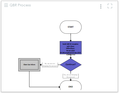 This tile displays the QBR Process Diagram for the campaign, the importance of this tile on the dashboard is that it allows you visualise and understand the status of the Quartely Review for the campaign.