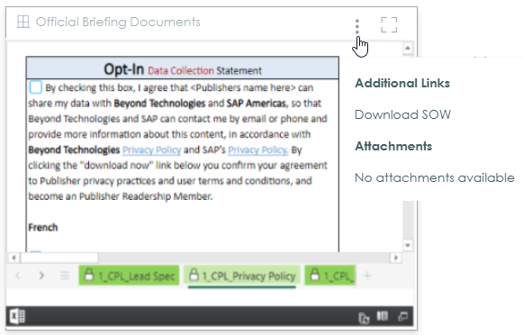 This tile displays the Campaign Briefing Document and the SOW Document. The CBD is viewed via a SharePoint Link to the document. Hovering over the elipsis (three dot menu) in the top right corner and clicking Download SOW will allow you to download the SOW for the campaign.