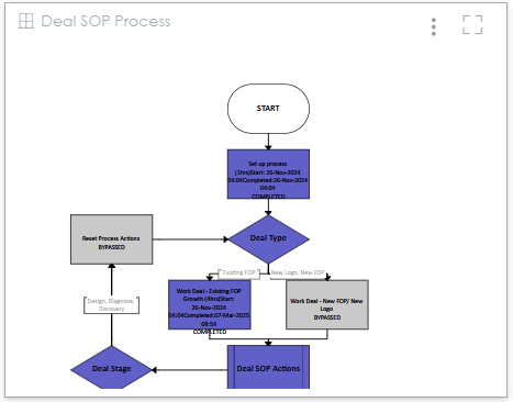 This tile displays the Deal SOP Process Diagram for the campaign, the importance of this tile on the dashboard is that it allows you visualise and understand the status of the Deal SOP for the campaign.